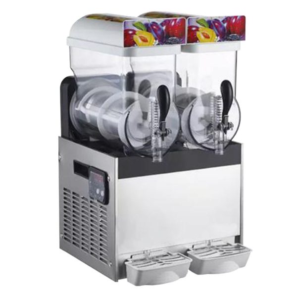 Base en acero inoxidable. Recipientes en policarbonato. Sistema de regulación de granizado. Paletas giratorias que evitan el asentamiento y la formación de hielo en la superficie.