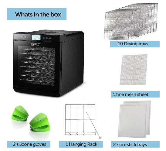 Especiosas bandejas ajustables de acero inoxidable: bandejas de rollo de frutas incluidas y estante colgante para JERKY. Utiliza las bandejas para alimentos regulares y las bandejas de malla para alimentos más pequeños como nueces y hierbas, para rollos de frutas utiliza la hoja de cuero de frutas que también se puede utilizar para bandejas de goteo. Disfrutarás del complemento especial del estante colgante para simplificar tu proceso de fabricación de cecina en el que puedes hacer mucho un lote con el lote con el lote Máquina de deshidratación Magic Mill, viene con 9 bandejas ajustables,