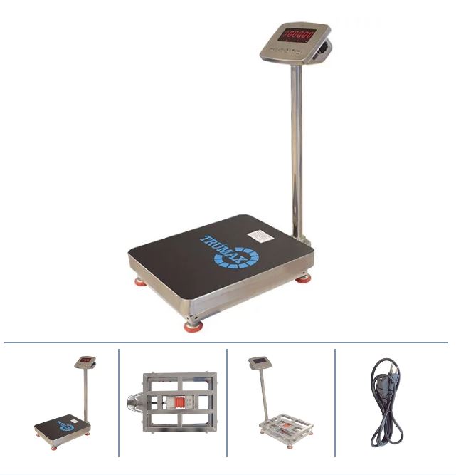 Bascula Trumax solo peso con estructura tubular y cubierta en acero inoxidable, celda de carga monobloque con capsula de proteccion contra humedad, topes para sobrecarga. Indicador solo peso full inox , display tipo LED rojo de alta visibilidad con batería recargable. Funcion de conteo por muestra y limites de peso. Capacidades disponibles: 60kg x 10g; 150kg x 20g; 300kg x 50g;