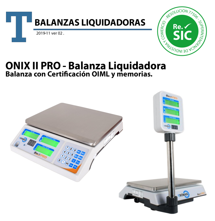 Balanza liquidadora marca Trumax, disponible en version plana o de Torre, fabricada en ABS de alta resistencia, plato en acero inoxidable de 34x24cm, display LCD, bateria recargable, Capacidad Maxima:15/30kg, Division de Escala 5/10g, Con certificacion OIML, homologada para metrologia Legal en Colombia, cumplen resolución 77506 de la Superintendencia de Industria y Comercio.